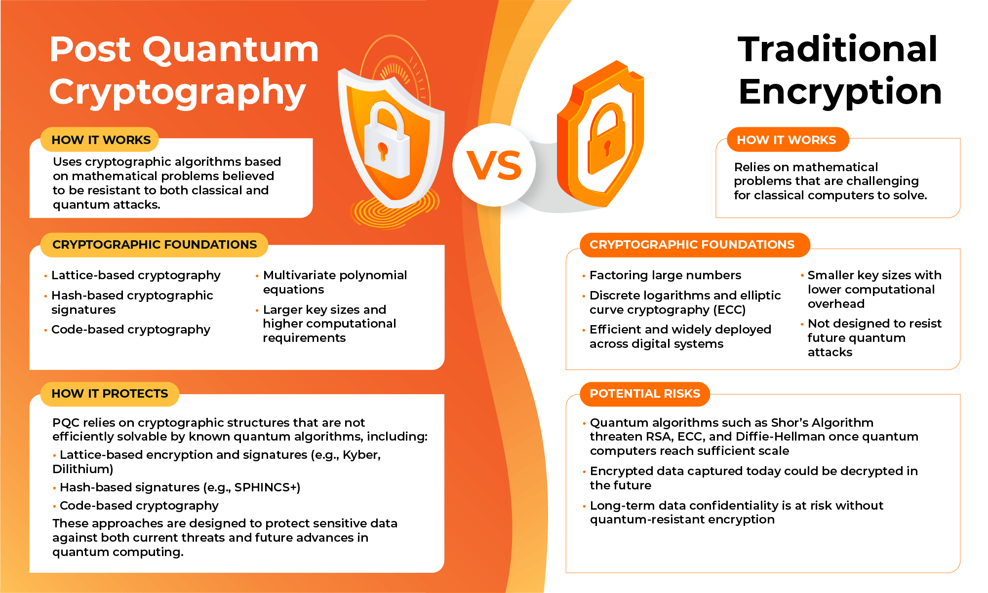 Post-quantum cryptography is a shift in digital security. Unlike traditional encryption that relies on mathematical problems classical computers find difficult to solve, post-quantum cryptography uses algorithms designed to resist quantum computer attacks.